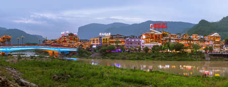 Wulingyuan, China - May 27, 2018: Town Wulingyuan at sunset in Tianzi Avatar mountains nature park.