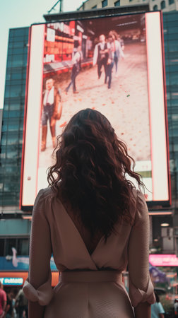 Back view of young woman with curly hair in beige dress looking at TV screen in Times Square.