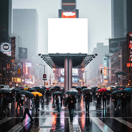 A large white billboard sits in the middle of a busy city street. The billboard is empty, but the surrounding area is bustling with people. Concept of urban life and activity, with people walking