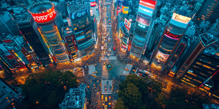 Elevated night view of crowded crosswalk in neon-lit city center, encapsulating urban energy