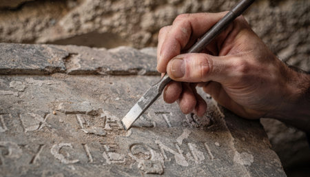 Artists hand steadying a chisel to restore inscriptions on a stone inset plaque with the rough textured wall behind rendered softly out of focus.