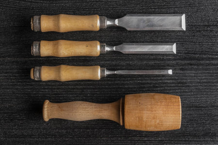 chisels and wooden mallet on a black background. joiner's workshop