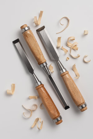 Set of woodworking chisels with wooden handles and wood shavings on a clean background. Professional carpentry tools for craftsmanship, DIY projects and joinery work.