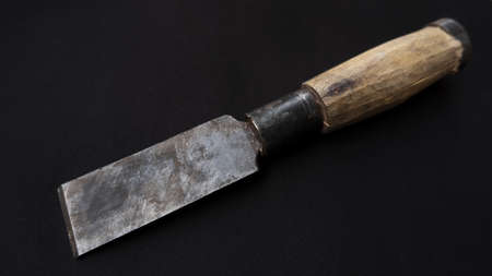 A closeup shot of an old rusty chisel with wooden handle isolated on a black background