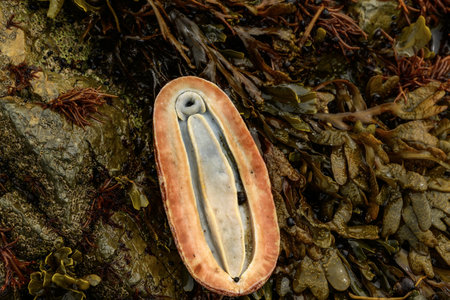 Steller's cryptochiton is a clam on a rock covered with seaweed