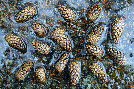 Pinecones on rocky surface at Geta mountain Aland, Finland after rain