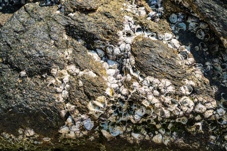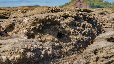 Close-up view of a rocky surface covered with barnacles and small marine shells on a sunny day