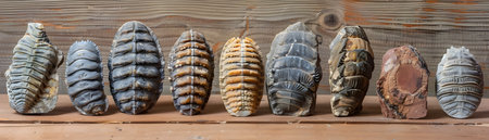 Beautifully Preserved Trilobite Fossils Displayed on Wooden Table A Captivating Collection of Prehistoric Marine Invertebrate Specimens