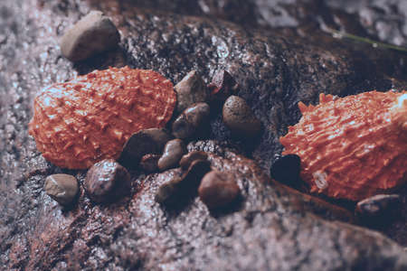 The rocks of the seabed were exposed at low tide. Attached clam shells and algae are visible on the rough surface. Close-up. Madagascar.