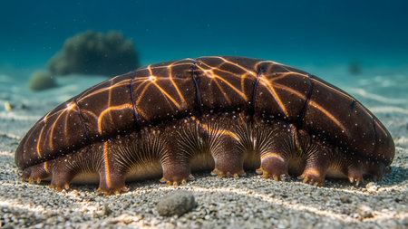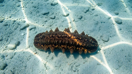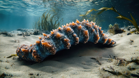 A curious sea cucumber exploring the sandy ocean floor, with its unique shape and texture adding to the underwater diversity.