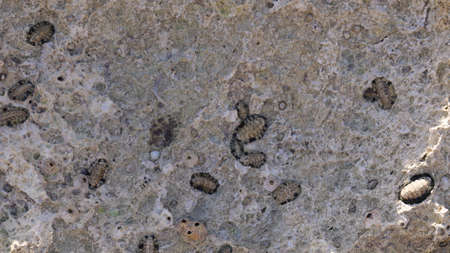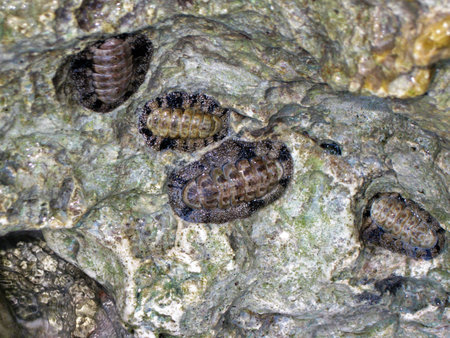 Detailed image showing a chiton nestled on a weathered rock surface, the intricate textures and patterns of nature. the earthy tones and rugged appearance emphasize maritime life, suitable for educational or environmental content. perfect for illustrating concepts of marine ecosystems and geological formations.