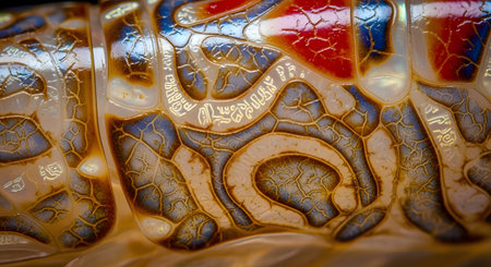 A macro, close-up shot of a complex pattern on a glossy, translucent surface, possibly glass or resin. The design features organic, cracked (craquelure) lines in blue and red, with mysterious, glowing golden symbols or script embedded within a clear, bubbly layer.