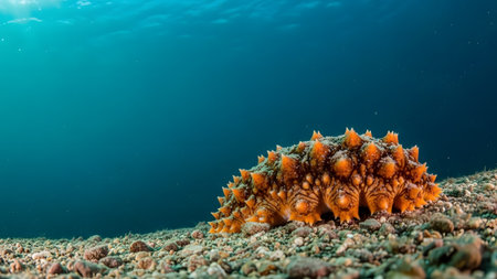A spiky orange sea cucumber rests on the sandy ocean floor against a backdrop of deep blue water. This marine invertebrate highlights the diverse and fascinating wildlife found in tropical underwater ecosystems.