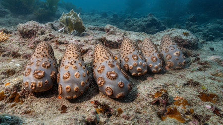 This stunning underwater image showcases a group of unique sea cucumbers resting on the ocean floor. The serene scene highlights marine ecology and biodiversity.