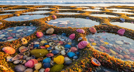 Rich tide pool ecosystem with various marine organisms living on a rocky coast