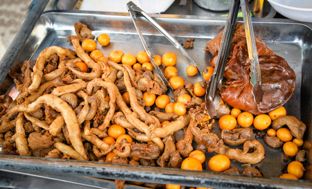 cluster of yolks chicken internal organs / immature eggs unborn cook stewed for sale on street food in thailand - Chinese style food