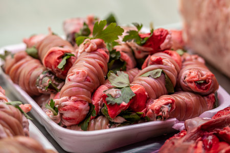 Raw lamb stomachs on store counter