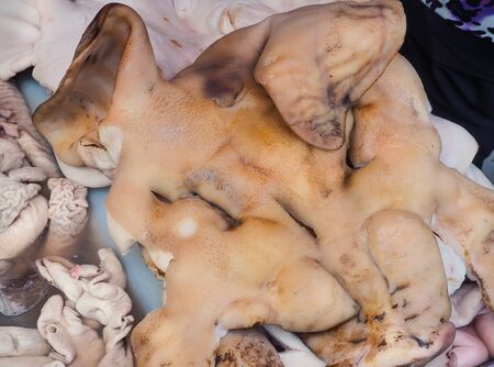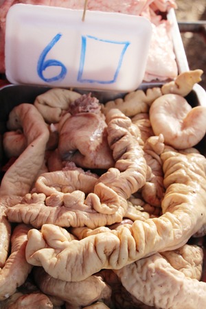 Chitterlings internal organs of pig hanging in the fresh market