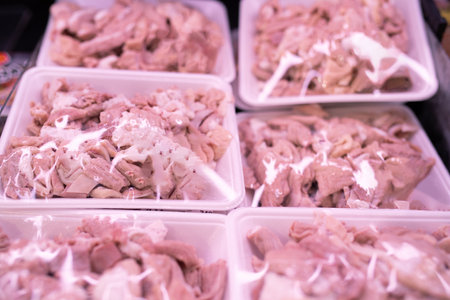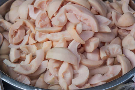 Sliced raw pork's colon meat that sale in the fresh market, as raw protein food background.