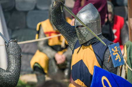 Knight Tournament. Medieval restorers fight with swords in armor at a knightly tournament
