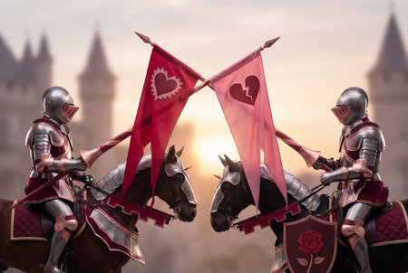 Two armored medieval knights sit on horses facing each other and crossing lances with flags depicting a red heart and a broken heart against a blurred castle background during a golden sunset.