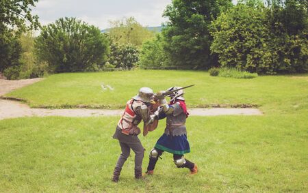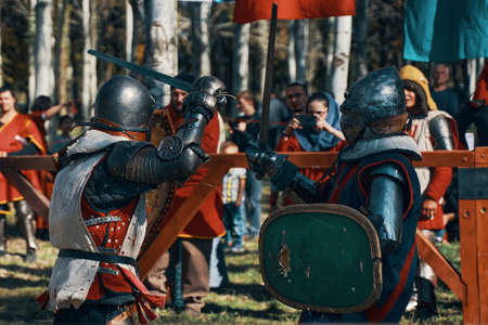 RITTER WEG, MOROZOVO, APRIL 2017: Festival of the European Middle Ages. Medieval joust knights in helmets and chain mail battle on swords with shields in their hands