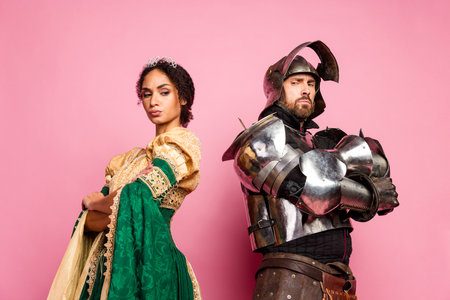 Medieval Couple in Themed Costumes Posing Against Pink Background