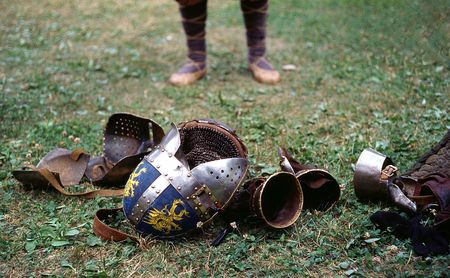 legs in a bast shoes, helmet and armour on the ground after the tournament