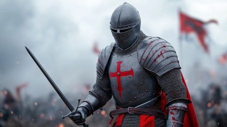 A brave and valiant knight, dressed in shining and polished armor, stands ready for an epic battle on a medieval field. Generative AI