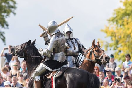 Imitation of medieval jousting. The battle of two knights with swords. Reconstruction of the historical tournament. Bishkek, Kyrgyzstan - October 13, 2019