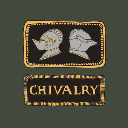 Medieval knight helmets and hand drawn lettering in decorative frames. Coat of arms heraldic equipment. Crusaders templar armour vector illustration in line art style. Chivalry and knighthood concept