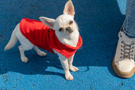 White chihuahua dog wearing red clothes standing on blue ground