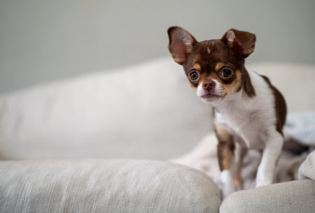 Adorable chihuahua puppy standing on a cozy sofa, gazing curiously with attentive eyes, radiating charm and playfulness in a warm living room