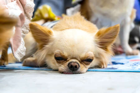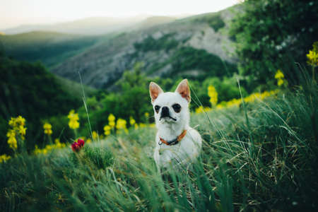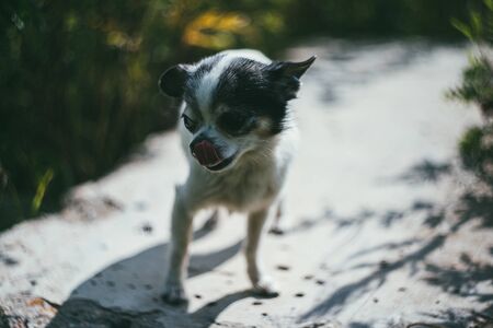 Funny little dog outdoors on a hot summer day. Chihuahua maxi longhair.