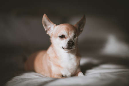 Eyeless Chihuahua dog, 12 years old on a bed