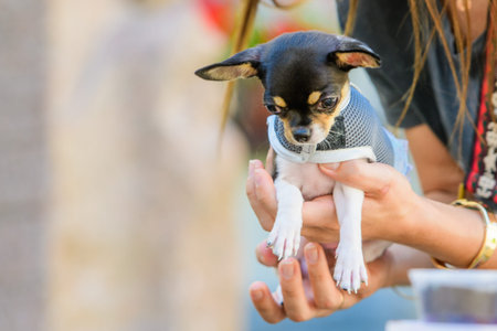 Chihuahua in the hands of a woman. Girl stroking her pet. Black with brown chihuahua