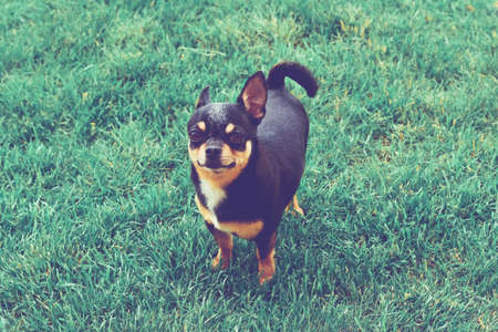 Chihuahua Dog on grass. Small dog. Chihuahua on a background of grass. Chihuahua dog for a walk. Chihuahua black, brown and white. Well groomed dog Chihuahua mini smooth haired