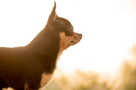 Chihuahua dog in profile on a sunset background. Black and brown dog in nature.
