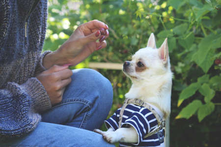 woman train chihuahua feed small white dog from hand in the green park