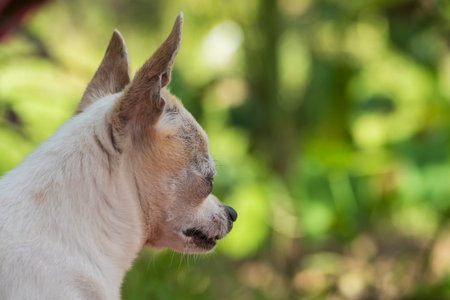 chihuahua dog head in nature, blurred background in green tones