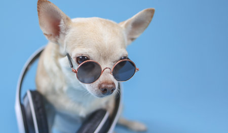 Close up image of brown chihuahua dog wearing sunglasses and headphones around neck, sitting on blue background. Summertime traveling concept.