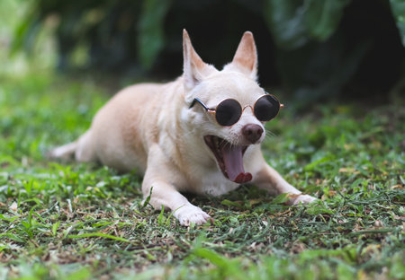 Portrait of brown chihuahua dog wearing sunglasses lying down on green grass in the garden, yawning with his mouth opened.