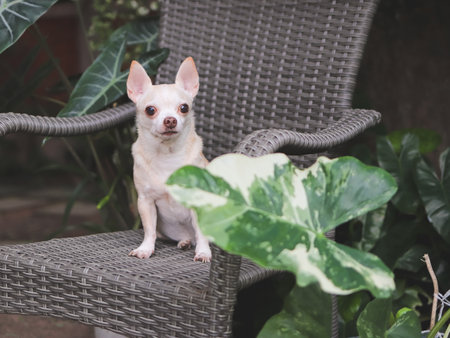 Portrait of brown short hair Chihuahua dog sitting on gray rattan chair with houseplant in the garden.