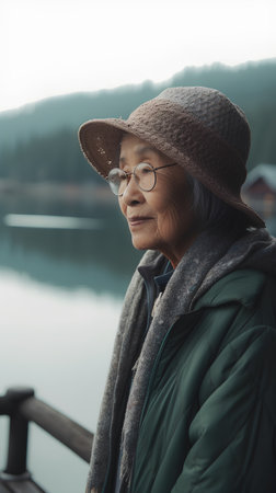 Portrait of senior Asian woman wearing hat and eyeglasses standing on wooden pier by lake in the morning.