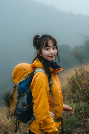 Young Female Hiker in Yellow Jacket Exploring Misty Mountainside with Backpack AI Generative