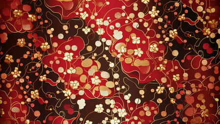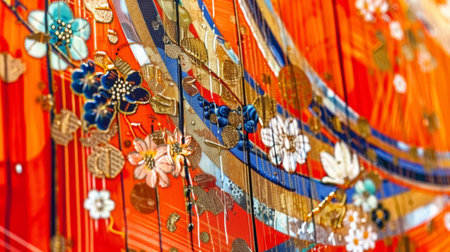 A detailed close-up of a floral pattern with red and gold elements, creating an artistic and decorative design.