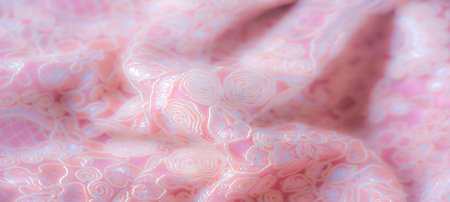 Blur. Peach lace fabric with an elegant floral and swirling pattern design, showing meticulous craftsmanship in its intricate textures and soft, pastel aesthetic, perfect for textile art