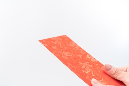 Man's hand holding with Chinese red envelope (red packet). Chinese new year concept.