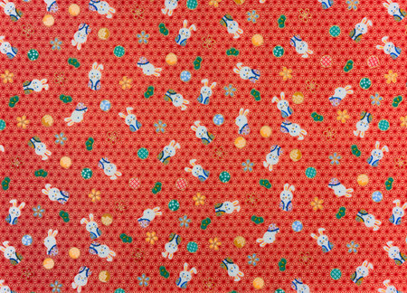 Photography of a traditional japanese furoshiki cloth printed with cute rabbits in hakama symbol of fortune, moving forward and cleverness against a seamless backdrop of hemp leaves called asanoha.