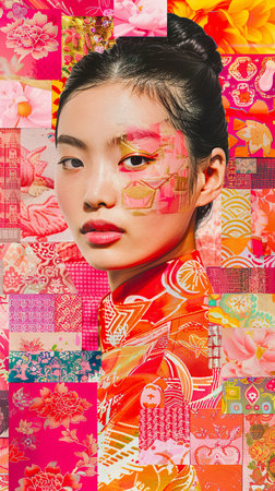Colorful Fashion collage Portrait of Asian woman and Floral Patterns.